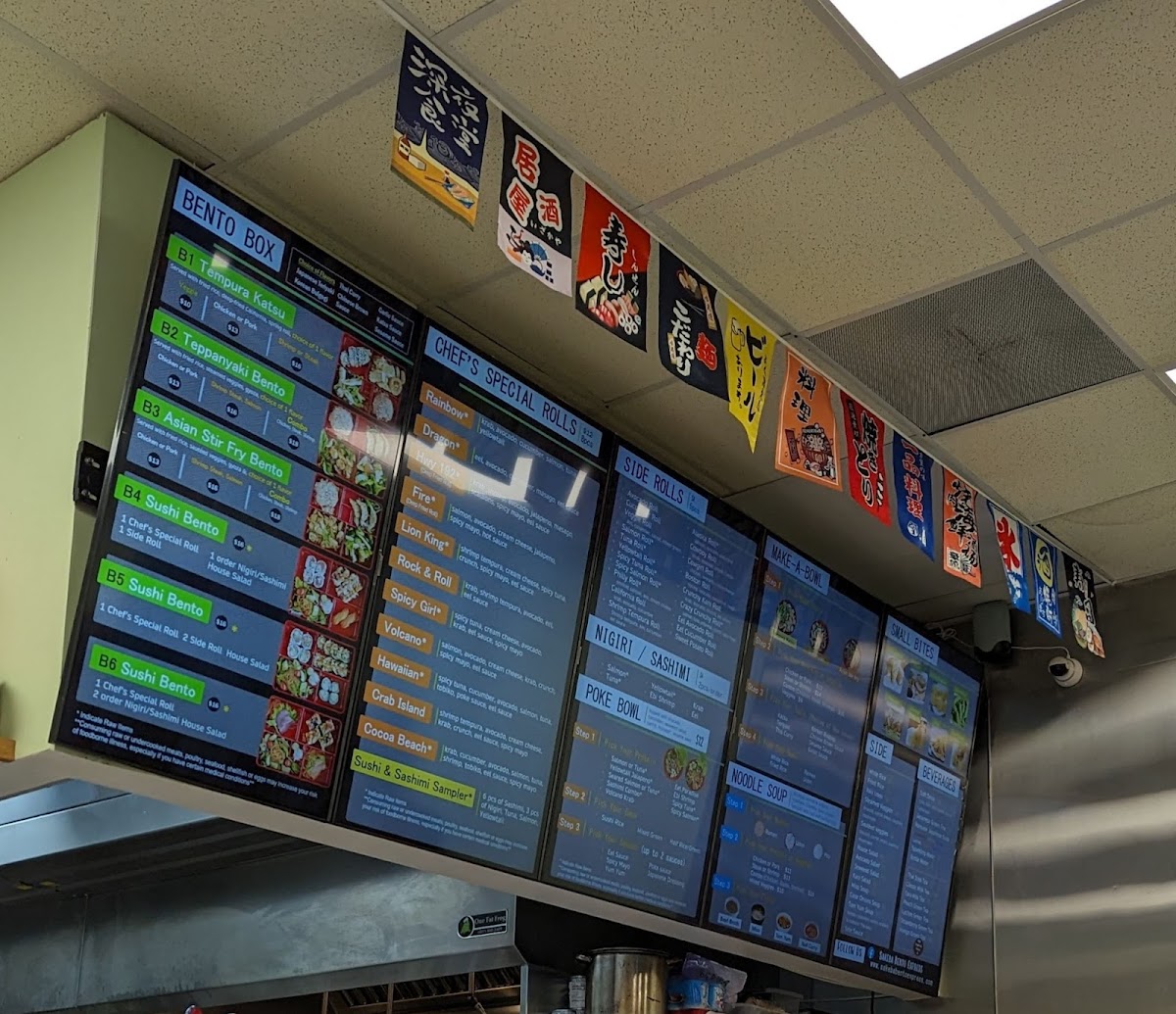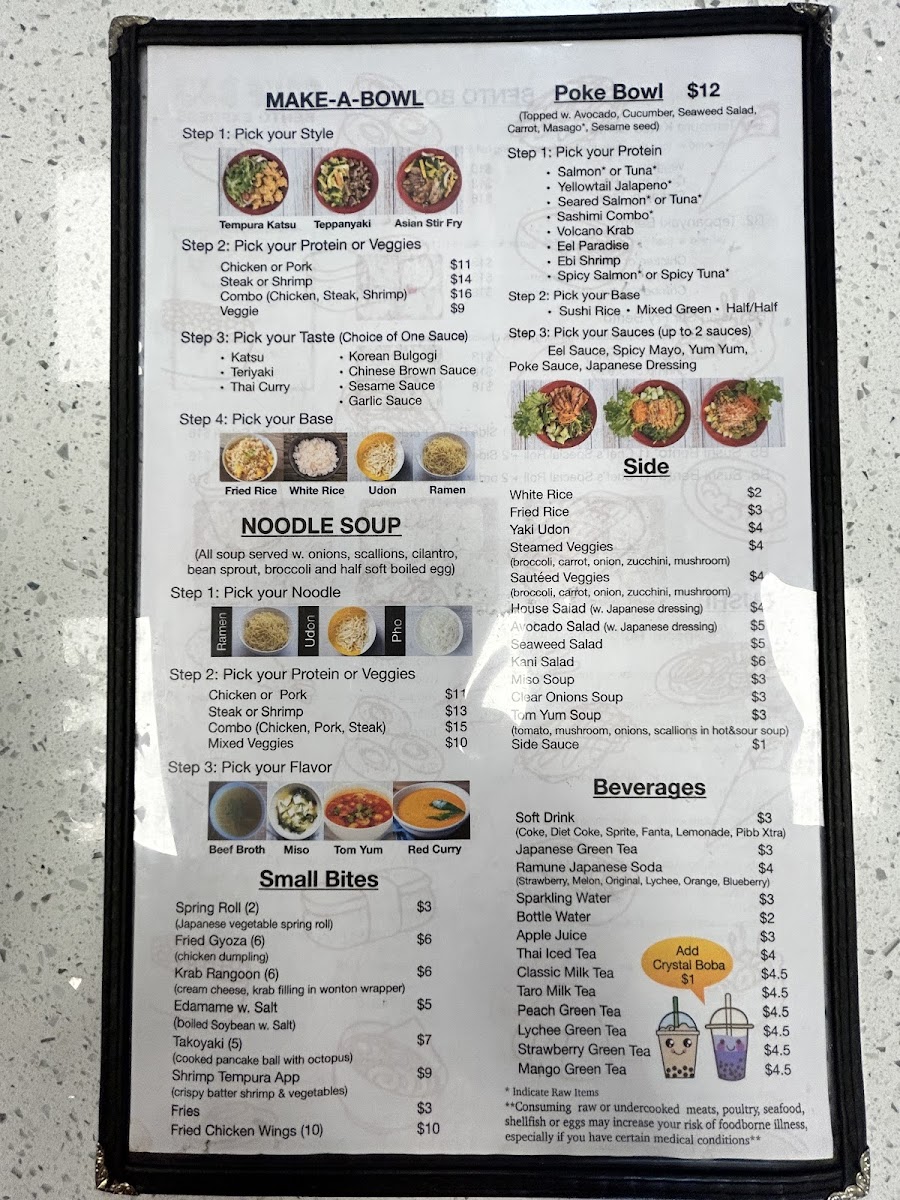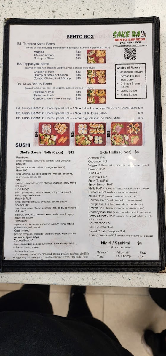 Beyond sushi, the menu expands confidently into hot dishes and bowls. Hibachi Fried Rice, Yaki Udon, and hearty Noodle Soup options like Ramen Soup, Pho Soup, and Udon Soup cater to guests craving warmth and comfort. The Bento Box lineup-Tempura Katsu Bento, Teppanyaki Bento, and Asian Stir Fry Box-along with customizable Make-A-Bowl options such as Tempura Katsu Bowl and Teppanyaki Bowl, round out the menu with filling, value-driven meals. Finally, refreshing drinks like Japanese Unsweet Green Tea (Can), Peach Green Tea, Lychee Green Tea, Classic Milk Tea, and Mango Green Tea provide a clean finish. Overall, the menu feels thoughtfully curated, approachable, and satisfying-an easy choice for anyone looking to enjoy Japanese-inspired flavors in Kissimmee.
